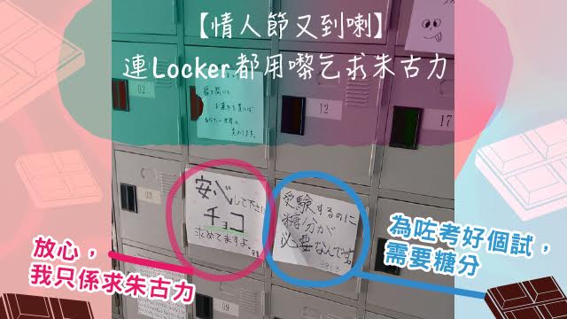 佢哋喺locker出面貼晒紙,寫住話自己好想要好想要好想要朱古力呀!直頭好似區議員拉票咁!毛毛問過成日睇愛情動作片進修日文嘅同事,佢話啲locker上面寫嘅係「呢度門開住嘅,放低啲糖喺度,你嘅世界就會唔同咗」、「畀啲糖嚟」呢啲喎~