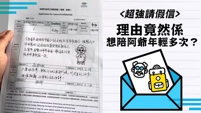 嗚哇!佢請假嘅理由竟然係佢見到爺爺感嘆自己冇好好感受年輕就已經變咗做阿伯,想陪爺爺再年輕多次呀!呢封孝子請假信真係睇到毛毛好滾動,而最滾動嘅係,佢腦細話:「只要動起來,年輕什麼時候都不晚,即使是到80歲。批准假期!」