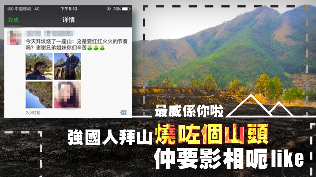 一班網友都睇唔過眼,將佢啲相send晒畀公安,話要報警拉佢!點知佢仲唔認係自己燒山,想賴落個女度,話係佢燒炮仗唔小心搞成咁喎!好彩最後個小朋友都講返個真相出嚟,原來係佢叔叔玩炮仗嗰陣唔小心點著咗啲野草,搞到成座山燒著咗囉。唉,強國人為咗求讚真係可以去到好盡,邊夠你哋玩呀仲!