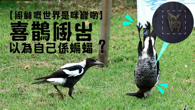 Er …… 隻喜鵲唔係以為自己係蝙蝠呀嘛?不過識掛就梗係倒掛喺blackman件衫度啦,就好似呢隻bat咁: