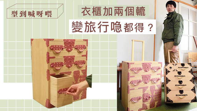 咩話,呢個就係山口先生設計嘅旅行喼呀?乜成個櫃咁樣樣嘅?冇錯,其實佢本身真係一個桐木衣櫃嚟,但加咗兩個轆之後,佢就成為咗一個「復古木製文青必備旅行喼」喇!