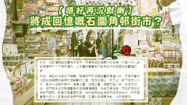 長發街市關注組收到風話石圍角邨街市都有被領展外判、城管打理嘅危機,一心諗住叫埋佢哋起來對抗PK Link,但點知嗰度嘅商戶已經一早打定輸數,逆來順受,打算喺強權底下沉默至被消失……