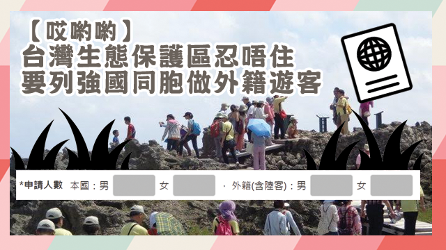 去台灣玩嘅強國同胞愈嚟愈多,而且仲唔止去買金買奶粉咁膚淺㗎,係會去生態保護區親親大自然嚟返個深度旅行㗎!不過會做啲人哋眼中唔文明嘅事咋嘛~