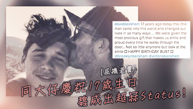 今日係碧咸大仔Brooklyn生日,碧咸就UP撈咗張同囝囝面貼面嘅合照,仲好感性咁講:「十七年前,呢個細路嚟到呢個世界,為我哋嘅生活帶嚟各方面嘅轉變。佢係我同老婆最珍貴嘅禮物,每次見到佢,都令我哋微笑同覺得驕傲。你大個仔喇,但笑容一樣!生日快樂!」