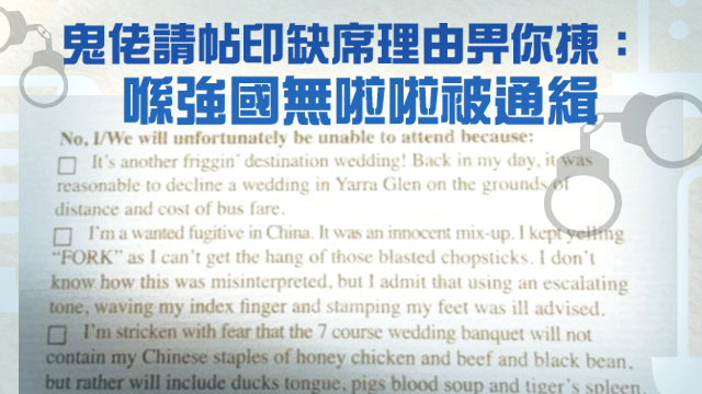 有個外國洋鬼子好大膽咁喺請帖度洩露國家機密呀!老老竇竇,成日都有人收到請帖又唔想去,於是就作啲講都冇人信嘅借口出嚟,今次外國一對新人就好大方喇,唔想嚟絕對OK,仲幫你諗埋原因?!