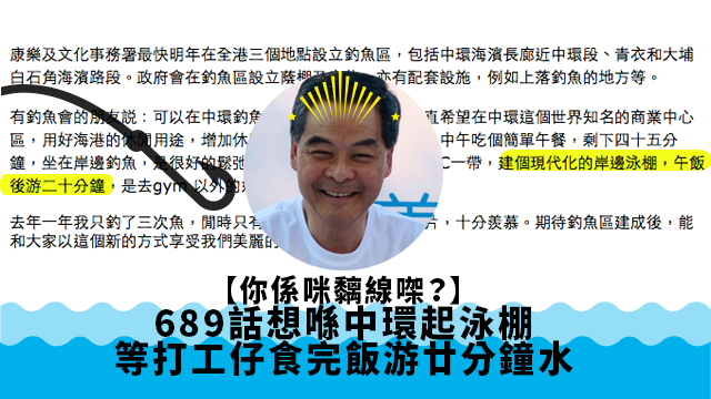 凸手一向重視民生就係人都知㗎啦,退休保障呀醫療開支呀嗰啲梗係有咁少得咁少,最緊要係起個泳棚畀中環,連食飽飯游水呢啲咁有常識嘅事都畀佢講得出,真係不愧為香港第一智將呀!