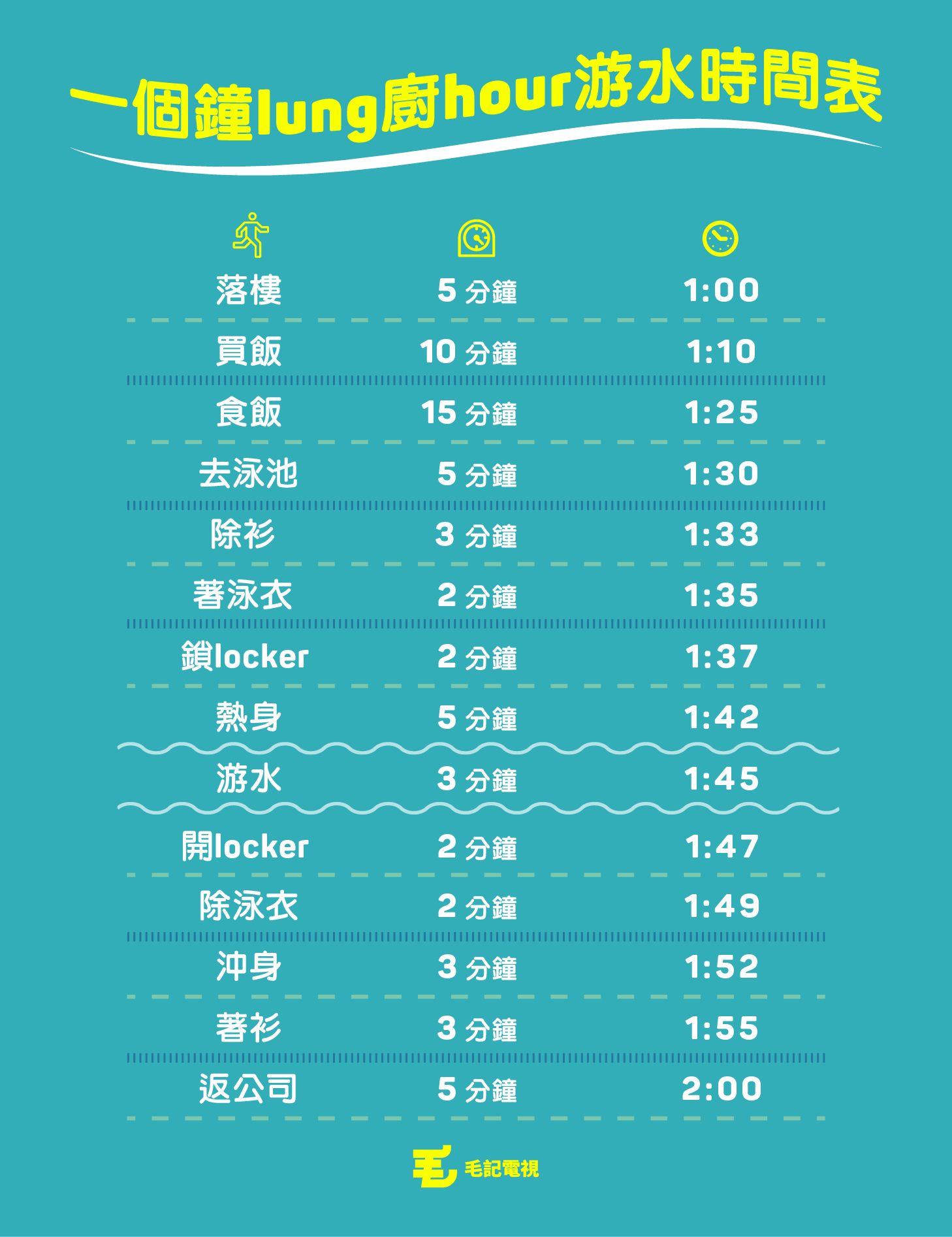 用一個鐘lung廚hour去游水呢件事真係好有益身心,為咗響應呢個活動,毛毛特登為中環嘅朋友仔整咗個游水時間表畀佢哋參考下,如果5分鐘之內行唔到去泳池就自己搭的士啦吓。