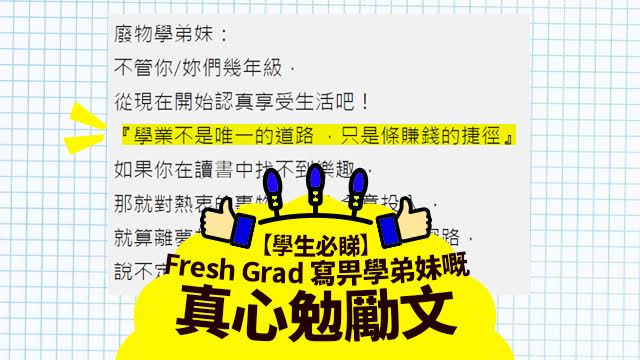 好喇認真喇,返過工就知,其實讀書真係成世人最開心嘅時間,要上堂溫書梗係辛苦啦,但開心嘅係可以有成班同學仔一齊玩到個課室反轉嘛!記住呀,讀書唔係唔重要,不過都唔係最重要,好似上面個Fresh Grad咁講,如果搵唔到讀書嘅樂趣,就試下全情投入你嘅夢想啦,世界好大,唔好諗埋一邊呀,學生哥。