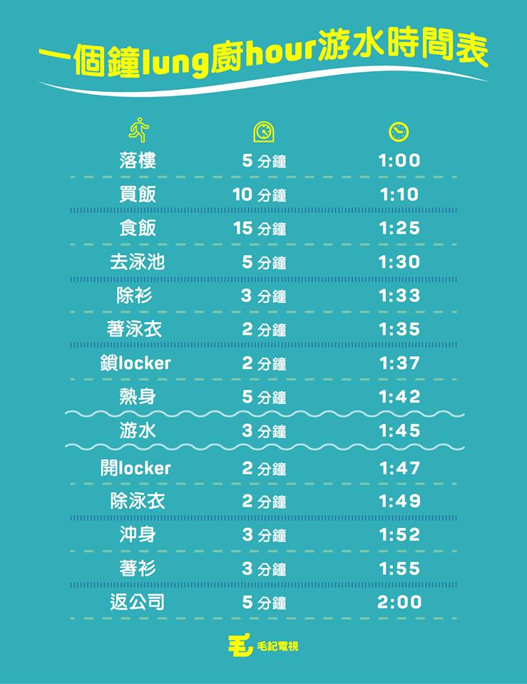 超然凸手689前幾日就發表咗個人類歷史上最前衛嘅偉論,想喺中環起個泳棚,畀班OT O到收工泳池都閂晒嘅打工仔打破時間嘅框框,lunch hour去游水refresh下自己,成件事真係好有意義!毛毛就住689呢個建議,用咗自己精密嘅人頭毛腦計一計,得出咗Lung廚游水係得嘅,可以游3分鐘咁多呀!