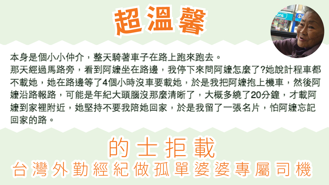 唔知係咪全世界啲的士司機都係咁鍾意彈客,台灣有個婆婆有一日一個人喺條街度截的士,可能司機怕老人家麻煩都唔肯載佢,不過就係因為咁識咗呢個咁好心地嘅經紀哥哥呀!