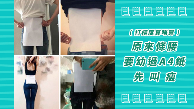 繼「反手摸肚」同「下乳夾筆」之後,最近有班女人又興起咗「A4紙度腰」嘅人比人比死人熱潮喇!呢個所謂「A4紙度腰」法,即係叫你將張A4紙打直放喺自己條腰度,如果張A4紙遮到你條腰嘅,咁即係你夠瘦、條腰嘅闊度仲窄過210毫米囉!