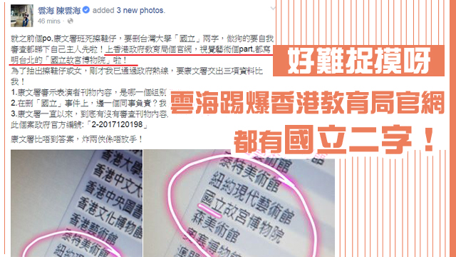 點知轉個頭就畀有香港炸両俠之稱嘅雲海踢爆,原來教育局個官網上面仲印住「國立故宮博物院」喎!喂,反了反了!