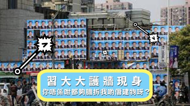 話說強國正苦本來就諗住要強拆呢幢僭建物㗎喇,點知個業主竟然拎習大大嚟做護身符,仲貼到成幅牆都係?!