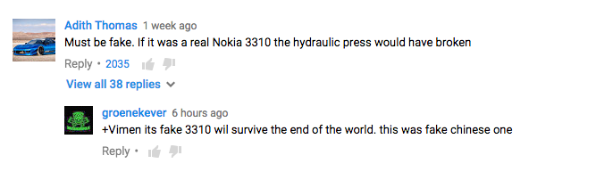 班外國網民都話呢部3310係假㗎,話原來呢個3310係中國造嘅,唔怪得知會砸得爆啦!唔信?你下次去強國搵部made in 差嗱嘅液壓機再試過,成間廠爆開都似呀!