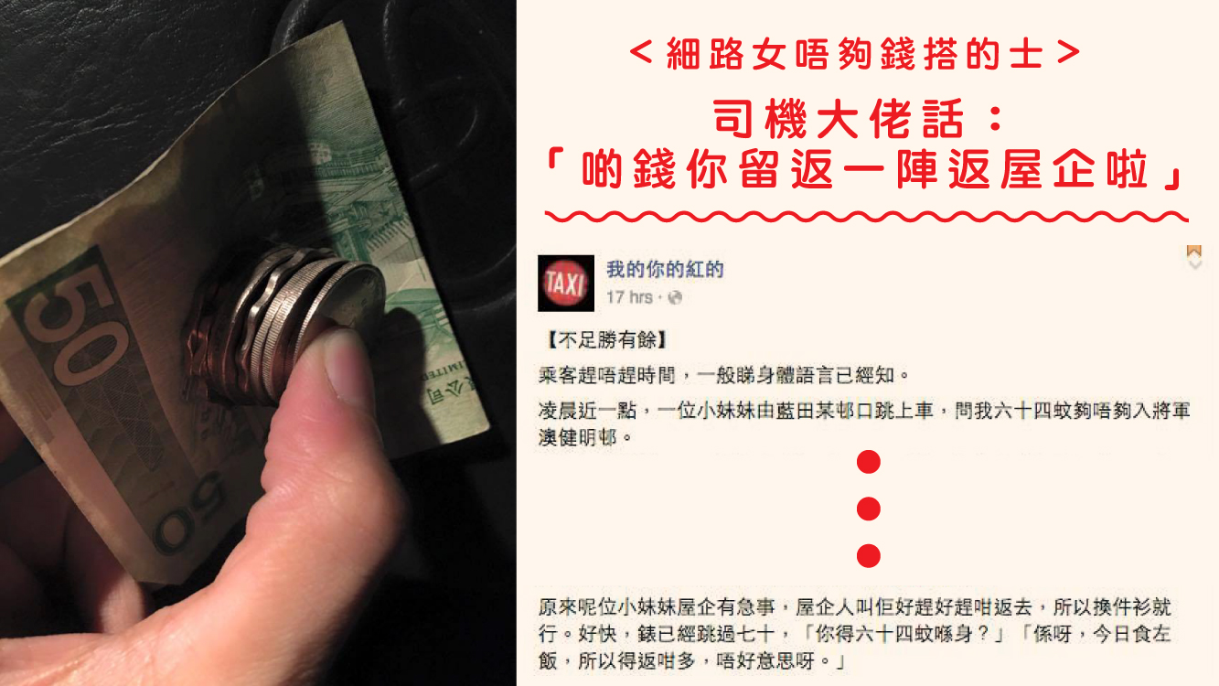 司機大佬真係好均真,本身唔打算收嘅呢六十四蚊就算畀唔返個小妹妹,都想捐咗佢喎。