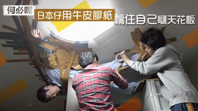 首先要用啲木櫃頂住個人,然後再用牛皮膠紙將條友嘅上半身黐實喺個天花度~