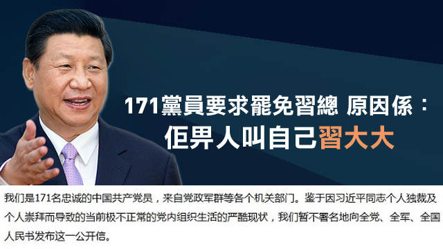 話說封信就係171位忠實黨員所寫嘅,佢哋喺封信入面就數晒習大大啲衰嘢出嚟,話佢獨裁、個人生活糜爛、又放任畀人叫佢做習大大,仲有推行個人崇拜等等喎!