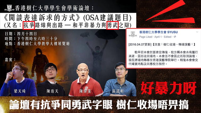 話說樹仁大學學生會想搞場學術論壇,點知學生事務處,即係OSA,話個論壇名有抗爭同勇武呢幾隻字太暴力,要學生會改改個名佢喎,之後當學生會宣傳嘅時候將新舊名擺埋一齊,OSA就話學生會違反承諾,要收返本來批咗嘅場,搞到個論壇差啲搞唔成呀!