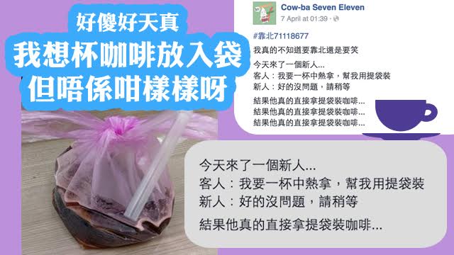 有個台灣7仔店員開post話佢間舖嚟咗個新仔,有客人話要杯咖啡,仲要放入膠袋嘅,點知個新仔竟然好好心機咁將杯咖啡直接倒入個膠袋度畀人……