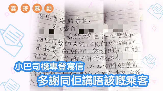 平時搭小巴返雙子塔,啲司機大佬通常都會喺毛毛未坐定嗰陣就開車,或者粗聲粗氣問候下毛毛老母咁!雖然啲司機對毛毛好唔客氣,但毛毛都會好客氣咁同返佢哋講聲唔該嘅!但估唔到,竟然有小巴司機因為啲乘客同佢講byebye同唔該,感動到要親手寫返封信去多謝返個乘客呀!