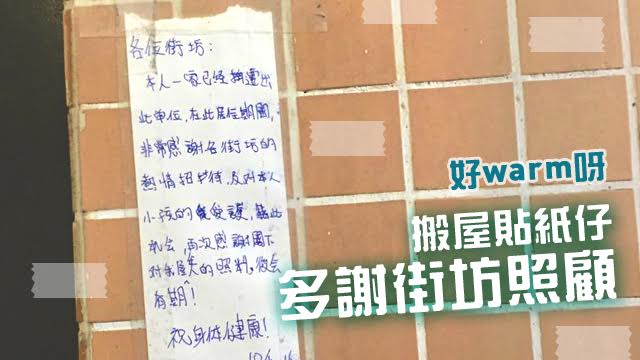 明明只係住兩隔籬,但又一啲膠流都冇,世上最遙遠嘅距離,莫過於此呀。不過呢,最近就有網民post相話佢個街坊搬咗屋,喺門口出面貼咗張紙仔多謝大家照顧佢同佢屋企人,仲祝大家身體健康?!大家好嚟好去,呢種街坊情,喺香港地買少見少嚕!