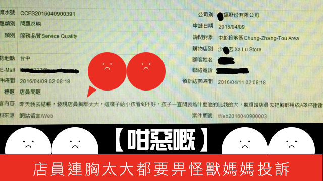 作為一個家長,梗係要凡事都為小朋友著想,呢個媽媽就衝出嚟保護佢心智未成熟嘅小寶貝喇。佢勇敢咁投訴店員胸部太大,驚畀小朋友睇到會唔係咁好呀!佢仲話小朋友係咁問點解店員會大過媽咪……55,一地都係玻璃?,大家小心踩親呀。