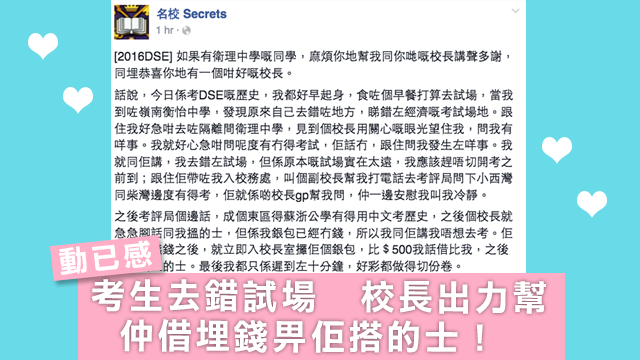 話說呢個學生去錯咗試場地點,但係距離歷史開考又就嚟夠鐘,於是佢驚到走咗入附近一間中學度求救!點知就畀佢遇上咗呢個好校長,唔單止出盡奶力幫佢,仲大嗱嗱借咗成五百蚊畀佢搭的士,趕去最近有得用中文考歷史嘅試場呀!