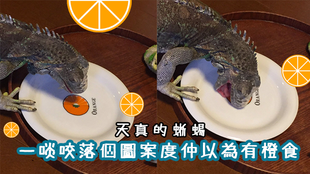 可能你哋會以為佢諗緊點解個碟上面冇嘢食,不過毛毛可以好肯定咁同你哋講,唔係!因為蜥蜴仔突然嘴張開,一啖噬咗落去隻碟個橙圖案度......