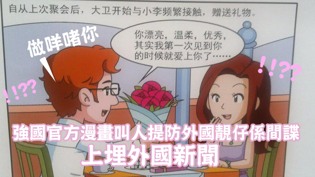 呢張十六格漫畫海報「危險的愛情」喺北京貼到周街到係,叫大家要小心外國勢力,由其係生得靚仔嗰啲呀!