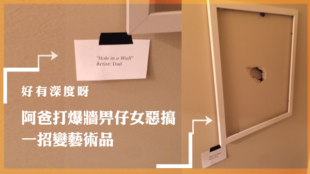 sorly毛毛7咗,原來呢個窿只係一個外國老竇嬲得濟一嘢打爆咗幅牆整出嚟咋。不過咁樣樣搞法,你唔怕你老婆發嬲,搞到你穿窿呀……個銀包。好彩佢對仔女醒目,識得一招將個窿變做藝術品咋!