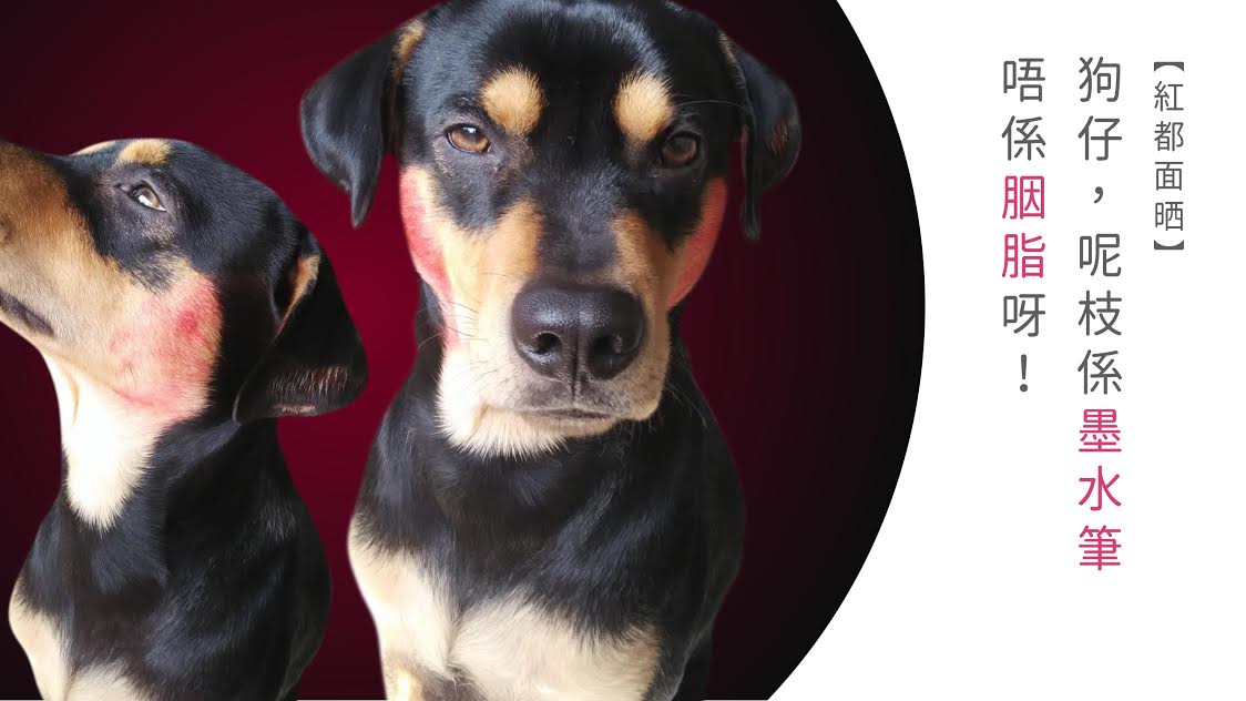 狗狗,唔好諗住擺個無辜樣出嚟就可以當冇事發生喎,你有冇照下鏡呀,紅都面晒咁樣樣,一睇就知係你偷咗枝墨水筆去當胭脂咁搽啦!
