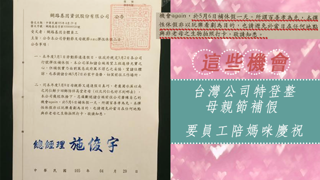 呢間台灣公司前幾日出咗呢張通告,成班員工見到即刻心心眼呀!事關佢除咗叫啲員工放勞工假嗰陣千祈唔好返公司做嘢,要好好咁出去玩之外,仲話因為母親節畀星期日食左,所以會喺6號星期五專登放多一日假,等佢哋可以返屋企同媽咪慶祝呀!