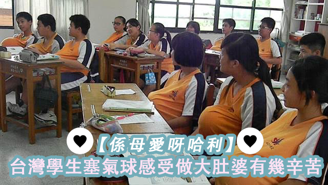 成日喺街度見到大肚婆行得好慢好慢,行步路都好似好攰咁,陀BB有幾辛苦,我哋真係想像唔到呀!最近台灣有間中學就搞咗個活動,要班中學雞塞個大波波入件衫度,上堂、去廁所、甚至打掃課室都要好好保護個波波,感受下做大肚婆有幾辛苦呀~