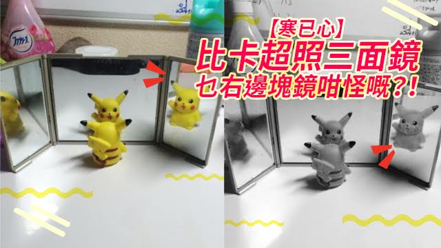 日本有個網友疑似食飽飯冇sss屙,將佢隻比卡超放咗喺三面鏡前面玩玩,仲幫佢影咗張相,點知張相唔講你唔覺,一講你就覺有啲古怪呀!唔知有咩古怪?睇真啲呀,再睇真啲都得喎,右邊塊鏡竟然照到比卡超個正面出嚟呀!係喎,正路應該好似左邊塊鏡咁照到側面先係㗎喎!