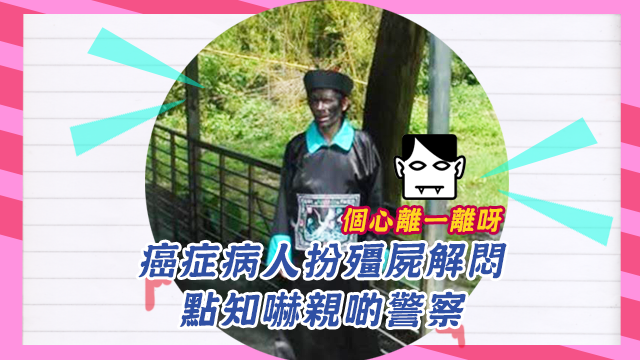 其實佢係一個喺醫院走出嚟嘅癌症病人,話覺得喺醫院太悶,咪買件清朝衫,整黑塊臉扮下殭屍解下悶咁喎,點知會嚇親行緊beat嘅警察嘅啫!個警察為免佢再嚇親其他人,就叫佢除返件衫整返乾淨塊臉,果然好似慈母一樣咁保護市民呀!
