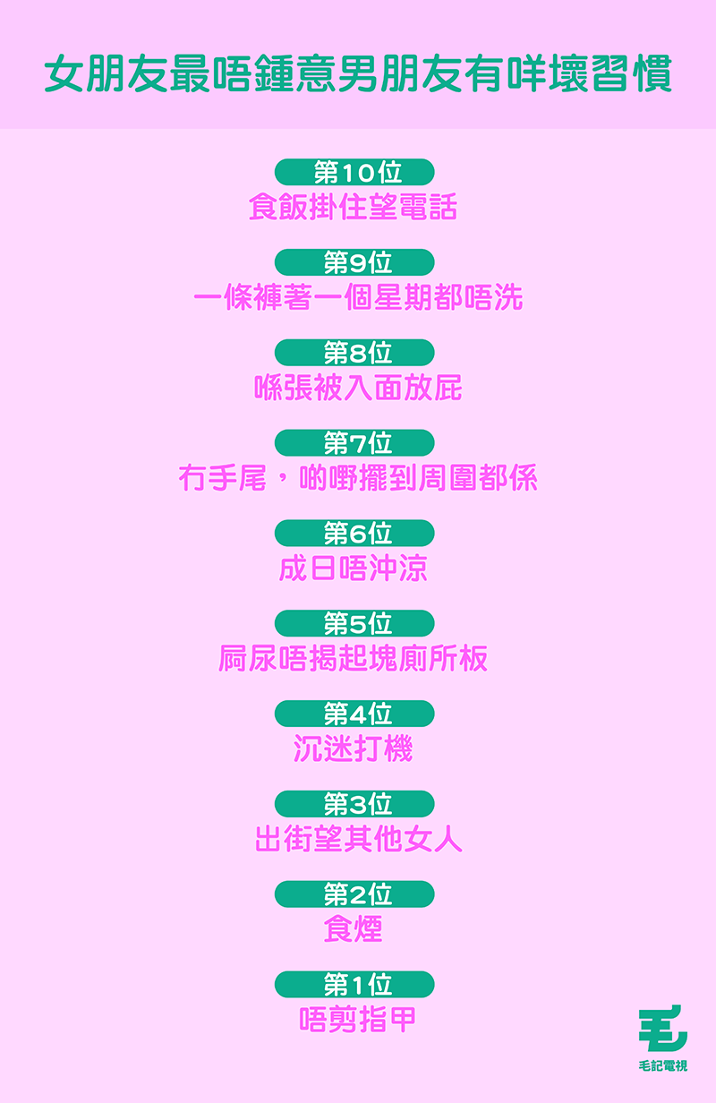 最近,日本網站《R25》就搵咗100個20到30歲嘅打工仔sss,叫佢哋揀出三個最唔鍾意女朋友有嘅習慣(最唔鍾意嗰樣就畀3分;第二唔鍾意嗰樣就畀2分;第三唔鍾意嗰樣就畀1分)。調查結果睇呢度: