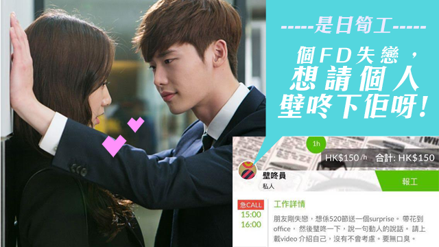 竟然咁都畀毛毛搵到份絕世筍工呀!有人話佢FD子啱啱失戀,所以想趁520請返個壁咚員畀個sur派時佢呀!嗚呀,有得壁咚又有錢搵,咁筍嘅工邊度有呀,唔好同毛毛爭呀!Between,唔知佢FD子係仔仔定女女呢,hehe!