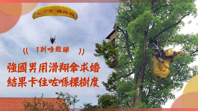 呼~一陣怪風,咁就將呢個痴情男一嘢吹咗去棵樹度,卡住咗落唔返地下……聽講佢女朋友見到呢幕都7到唔敢睇,默默咁就走咗……其實呀,老老竇竇,如果係真愛嘅求婚使乜搞咁多嘢吖,送層樓、或者送架車,再唔係送隻十卡嘅鑽石介指,毛毛肯肯定你女朋友會即刻嫁畀你呀!