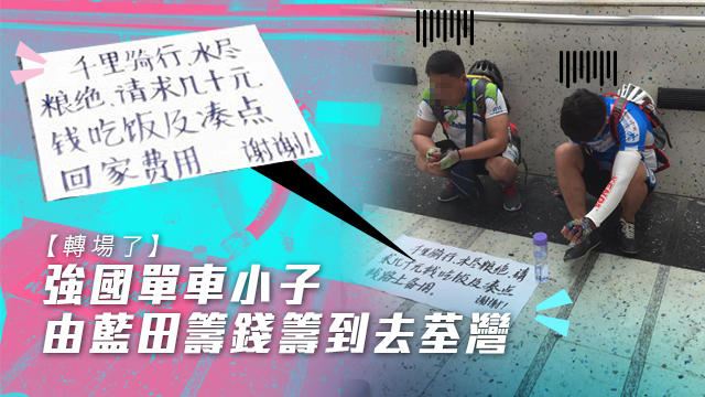 是咁的,話說今日上晝十一點半左右,有網民喺荃灣千色對出條橋度見到呢兩位疑似來自強國嘅單車小子,佢哋踎喺地下低頭思故鄉咁款,斷估都應該係需要人哋幫助,佢哋面前仲放咗張咁樣樣嘅紙?: