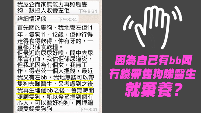 可能呢個主人喺經濟上真係遇到好大問題啦……不過毛毛覺得,其實冇錢又點吖,毛毛夠窮到褲穿窿啦,開講有話辦法總比困難多,或者有方法可以解決到問題呢?毛毛諗狗狗都想主人陪自己陪到老嘅,希望呢位主人可以繼續照顧呢隻狗狗啦。