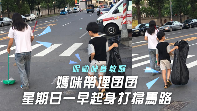 但係台灣竟然有小朋友放假都唔賴床,晨咁早走出街掃馬路?最近有網民話喺高雄見到有對母子帶埋掃把同掃把袋一邊行一邊掃地,見到有垃圾就幫手執起佢!