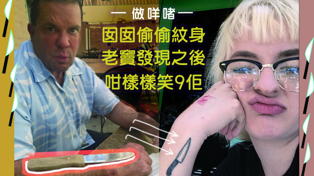 咦你紋把刀上手度,唔通你就係外國雙刀火雞姐?係唔係毛毛就唔知喇,不過原來佢個紋身係暪住屋企人去紋㗎!有冇搞錯!愛因斯坦都有講啦,身體啲毛,屬於父母,毛啦啦粒聲唔出走去紋身,阿爸阿媽會唔會嬲㗎?冇錯,佢阿爸不單止冇嬲,仲笑9返個囡轉頭呀!