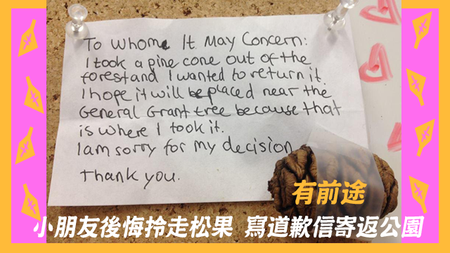 但係個小朋友後來唔知係因為畀爸爸媽咪鬧,定係良心發現呢,竟然寄返粒松果去國家公園,仲寫咗封信道歉呀。小朋友話,希望工作人員可以幫佢放返粒松果去原來棵樹度~真係好有童真呀~