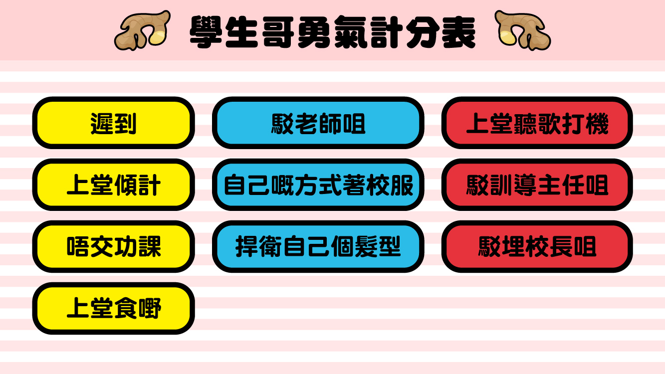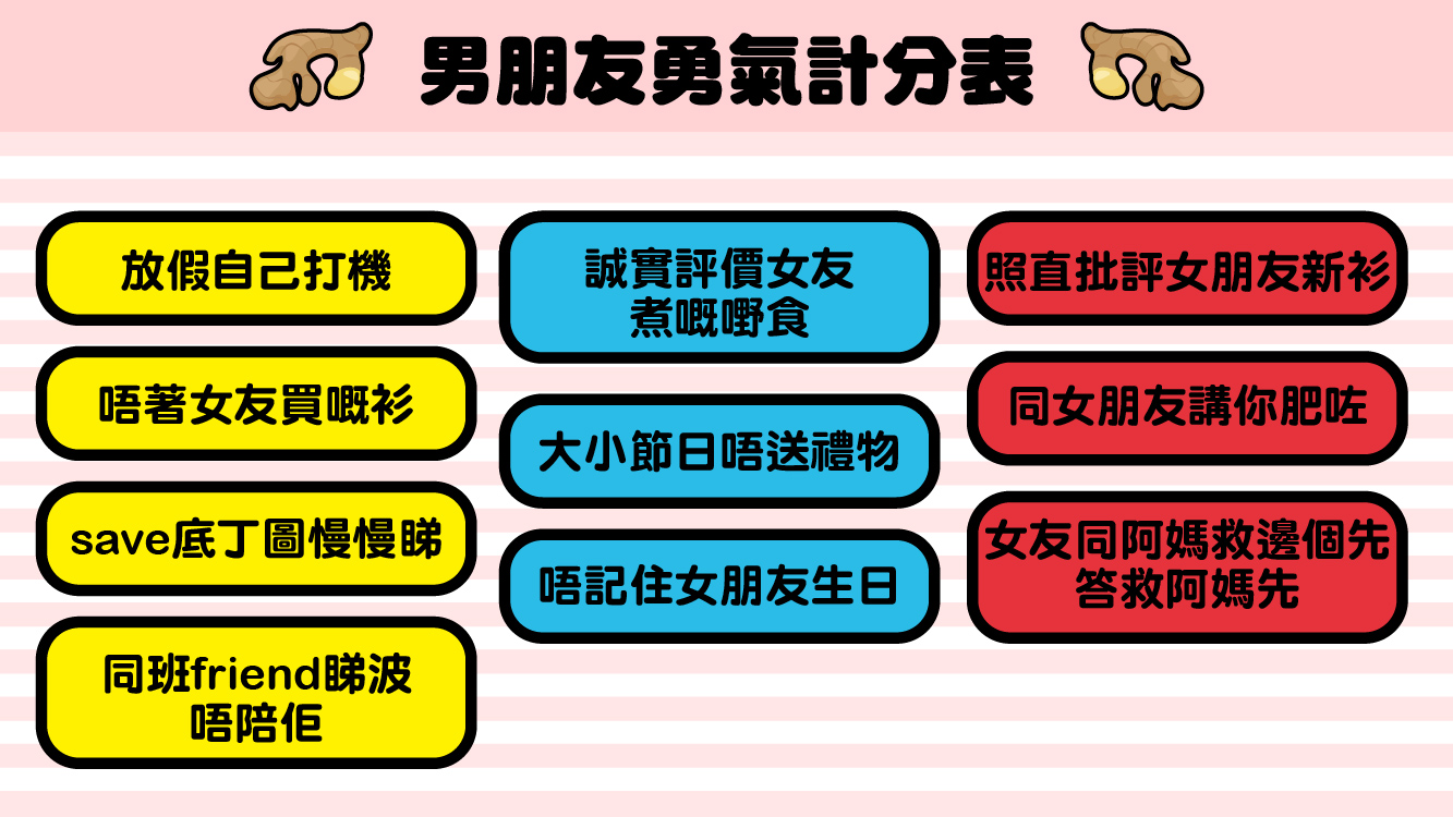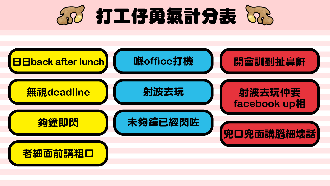 做人最緊要就係夠薑!不過幾多薑先叫夠呢?嗱,唔知自己夠唔夠薑唔緊要,呢度下面有三個表,跟住指示計分就得喇,不如做個測試睇下自己有幾夠薑?