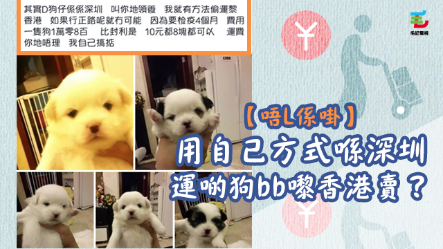話說呢位H網民就開post,話自己喺深圳有啲狗bb,想搵人領養喎~不過呢,佢就講到明話自己唔會「行正路」,因為「行正路」嘅話要等成4個月時間檢疫,加上又要畀成萬蚊費用,所以佢會用自己方式運啲狗落嚟喎……