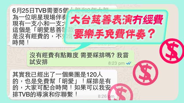 答案就喺呢度!噚晚有個樂團post咗張WhatsApp cap圖出嚟,話自己收到邀請去大台一個慈善表演,不過就連like & share都唔會畀返你,係冇錢收返㗎。諗落都幾商機無限喎,大台嘅商機呀。