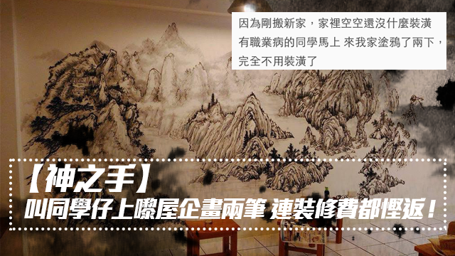 話說有位台灣網民就啱啱搬咗屋,而間新屋仔入面係咩裝修都未有,淨係得四幅牆嘅,有同學仔見到佢屋企家徒四壁咁款,就諗住上佢屋企幫幫手啦~點知呢位同學仔竟然喺幅牆度揮一揮衣袖,留下呢幅世紀大作喎……