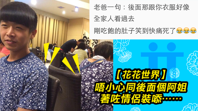 是咁的,話說有位台灣網民同屋企人飲飲下茶嘅時候,佢老竇突然叫佢轉身望下後面個阿姐,原來佢唔小心同後面個阿姐著咗情侶裝呀!嘩,如果呢對大小印花有緣人一齊行出街,實閃死街邊啲人~