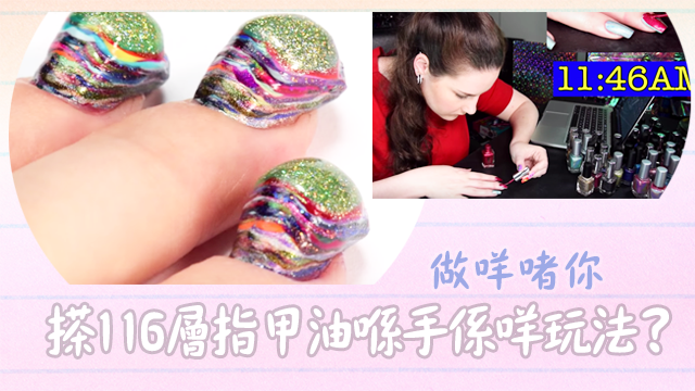 而最近,有位來自加拿大嘅美容師Christine Rotenbertg就成功挑戰搽116層指甲油喺隻手度。嗱,大家唔好以為搽指甲油呢家嘢好簡單,呢樣絕對係耐性嘅考驗,事關你要等一層乾咗你先可以搽第二一層㗎!所以佢最後咪由朝搽到晚、足足搽咗成12個鐘先完成到囉……