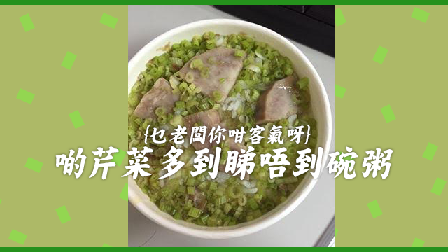 如果係鍾意食蔥呀莞茜呀芹菜呀呢類青、覺得佢哋好香口嘅朋友仔,去食嘢就算唔記得凍飲嗌少冷,都一定會記得份嘢食要嗌多青!話說呢位網民去買芋頭粥嘅時候,就同老闆講要多啲芹菜啦,點知啲芹菜多到!嘩唔講仲以為呢碗係芹菜粥呀!